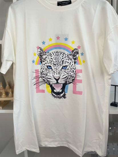 Dit leuke T-shirt is een maat. En kun je dragen tot een kleine maat XL.